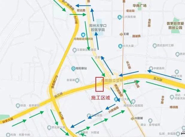 (3)北三环辅道自东向西车辆,行驶至北三环与南阳路交叉口右转绕行至江山路/宏达街/京广路/北三环。