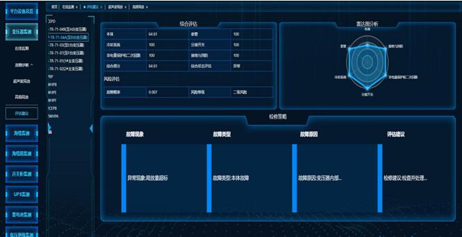 EOMS设备健康监测系统能够对电气设备维保记录、运行数据、电气日常管理方面的数据进行收集、分析、筛选。通过收集现有系统中电气设备运行数据、设备维保记录、在线监测系统记录、工作记录、检查记录、设备问题或隐患等,并将所有信息与设备和平台进行关联,生成工作人员需要的报表内容,并从电气设备管理、数据标准化服务、报表数据分析等方面提升电气设备标准化、智能化管理,具备数据分析和辅助决策能力。可视化方式全面展示各平台的设备实时健康评估状态,便于全面掌握准确的设备状态进行预测和总体分析。